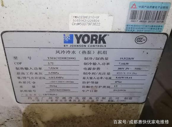老客戶打電話來說空調(diào)調(diào)到制熱后跳閘后就不能正常運(yùn)行了。他們是一所茶樓會(huì)所,使用約克中央空調(diào),水循環(huán)系統(tǒng),對(duì)于中央空調(diào)來說維修起來比普通家用空調(diào)復(fù)雜得多,因?yàn)楸緛碇醒肟照{(diào)元件非常多,容易出現(xiàn)故障。此機(jī)器為約克風(fēng)冷冷水(熱泵)機(jī)組型號(hào)為:YMAC023HE2100G,生產(chǎn)日期為2012年9月26日。
