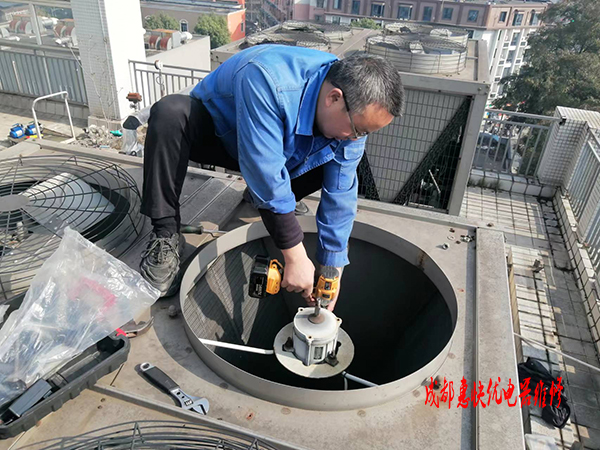 維修一臺(tái)水冷式中央空調(diào)風(fēng)機(jī)出現(xiàn)了異常的聲音(現(xiàn)場(chǎng)聲音非常大),據(jù)用戶講已經(jīng)有一段時(shí)間 了,但是在樓頂上就沒有人去管它,但是最近鄰居反映有噪聲,就不得不維修。